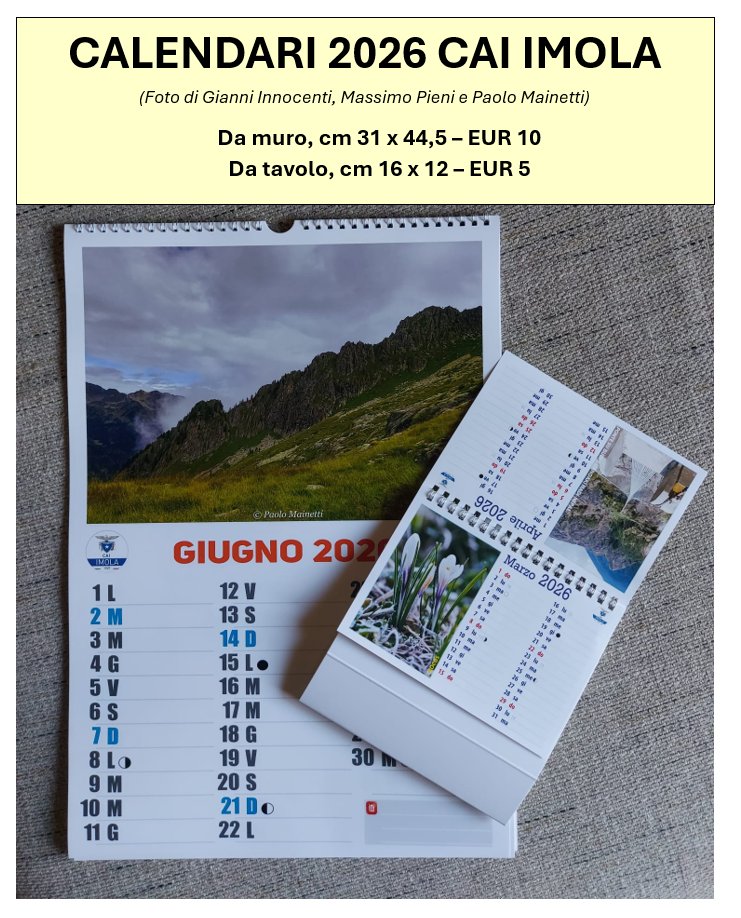 ![]() | CALENDARI 2026 CAI IMOLA (Foto di Gianni Innocenti, Massimo Pieni e Paolo Mainetti) Da muro, cm 31 x 44,5 – EUR 10 Da tavolo, cm 16 x 12 – EUR 5 VENDUTI TUTTI! Stiamo valutando l’opportunità di ristampa, in funzione delle richieste. Se siete interessati mandate un messaggio WhatsApp a Giannino, 335 7173120, indicando se da muro o da tavolo ENTRO il 28 NOVEMBRE [ingrandisci la foto] (11 NOV) |