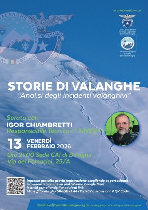 ![]() | VENERDI’ 13 FEBBRAIO – ORE 21:00 SEDE CAI DI BOLOGNA STORIE DI VALANGHE Analisi degli incidenti valanghivi Serata con Igor Chiambretti Responsabile Tecnico AINEVA [locandina] (22 GEN) |