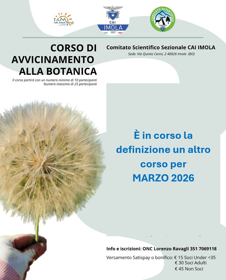 ![]() | CORSO DI AVVICINAMENTO ALLA BOTANICA Il corso di ottobre 2025 è TUTTO ESAURITO. E’ in corso di definizione un altro corso per MARZO 2026; le date esatte vi saranno comunicate via mail. IMPORTANTE! NON PAGARE ADESSO MA A MARZO 2026 Indirizzo dell’evento: Sede CAI Imola via Quinto Cenni 2, Imola Contatti: ONC Lorenzo Ravagli 351 7069118 Iscrizioni a questo [LINK] (30 SET) |