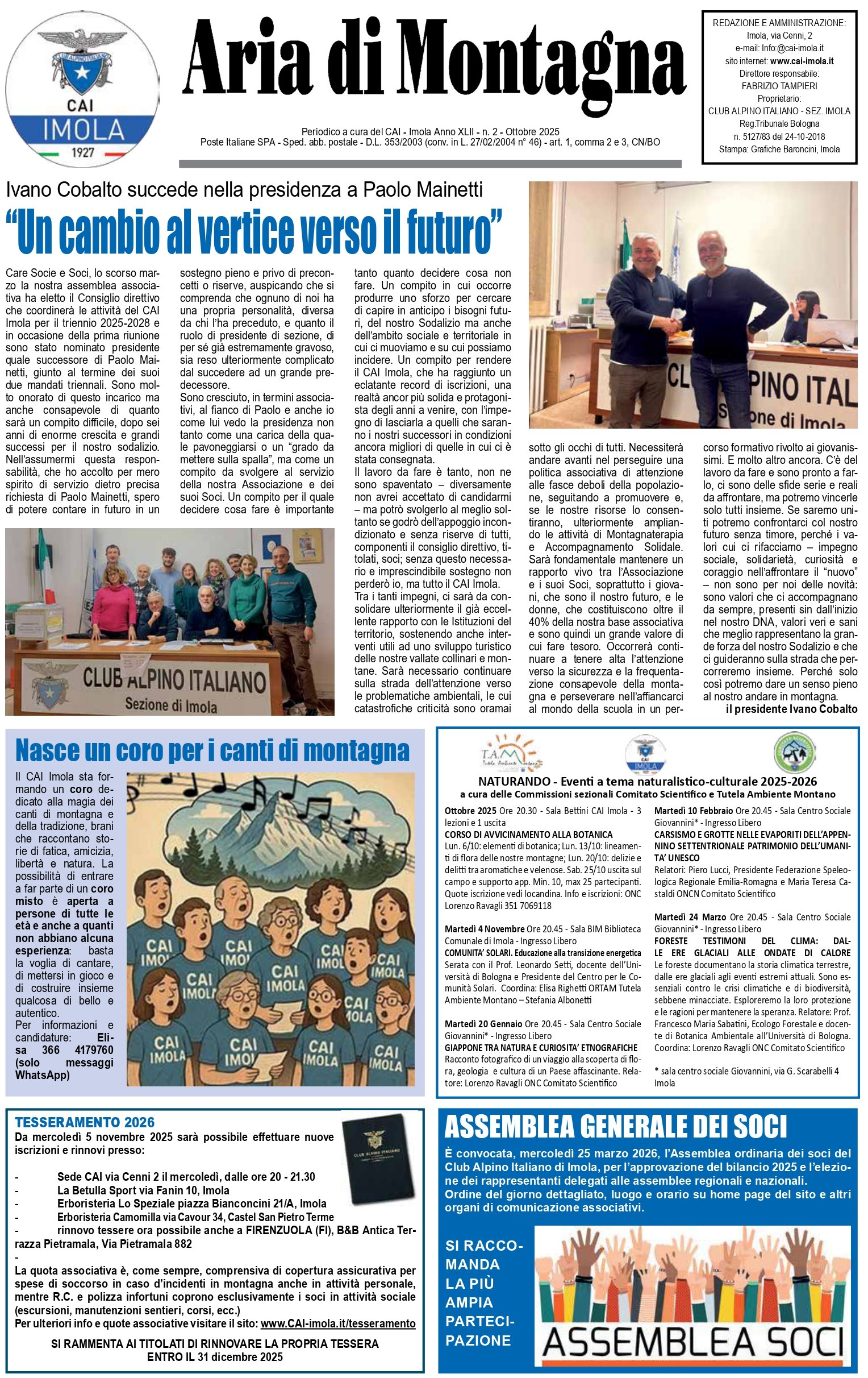 ![]() | ARIA DI MONTAGNA OTTOBRE 2025 [clicca qui] Cara socia, caro socio, ecco il nuovo numero, “Aria di Montagna”, il periodico della nostra sezione disponibile per te sul nostro sito per essere consultato e/o scaricato. Nel caso in cui tu preferisca una tradizionale copia stampata, la potrai ritirare gratuitamente presso la tua sezione in via Q.Cenni 2 a Imola, tutti i mercoledì dalle 20:00 alle 21:30. Un caro saluto – Il Presidente della Sezione – Ivano Cobalto (25 SET) |