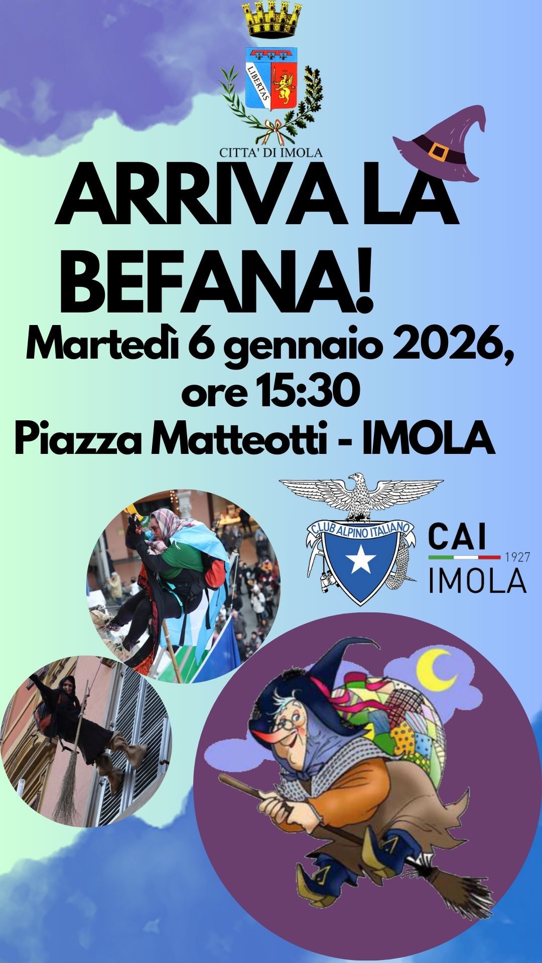 | MAR 6 gennaio | BEFANE CAI | ARRIVANO LE BEFANE DEL CLUB ALPINO ITALIANO DI IMOLA!!! – PIAZZA MATTEOTTI – ORE 15:30 |