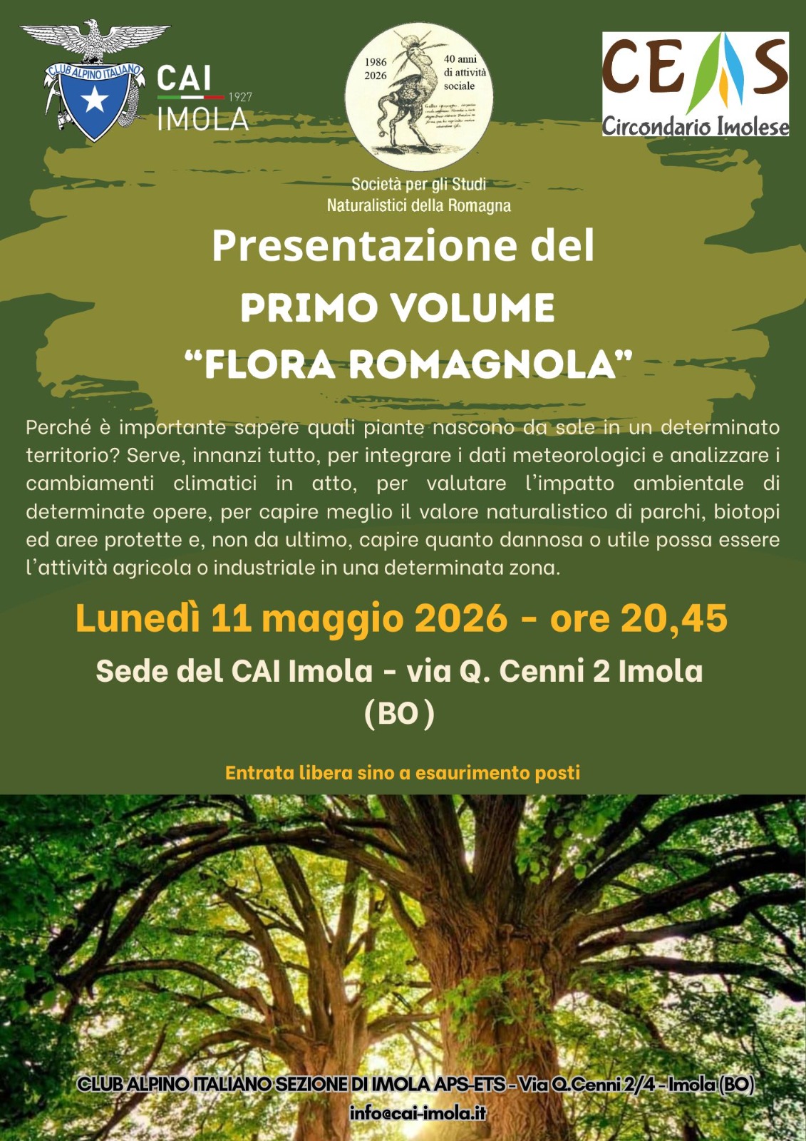 LUN 11 maggioCONFERENZE20:45 – SEDE CAI     PRESENTAZIONE DEL PRIMO VOLUME DEL CENSIMENTO FLORISTICO DELLA ROMAGNA