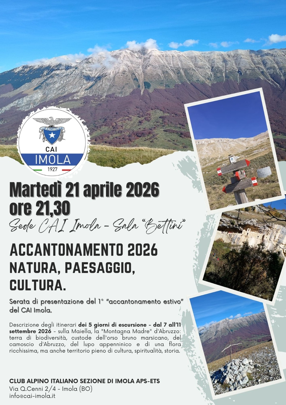 | MAR 21 aprile | CONFERENZE | ACCANTONAMENTO 2026, NATURA, PAESAGGIO, CULTURA. - ore 21:30 Sede CAI - Sala "Bettini" - Serata di presentazione del 1° "accantonamento estivo" del CAI Imola. [locandina] |