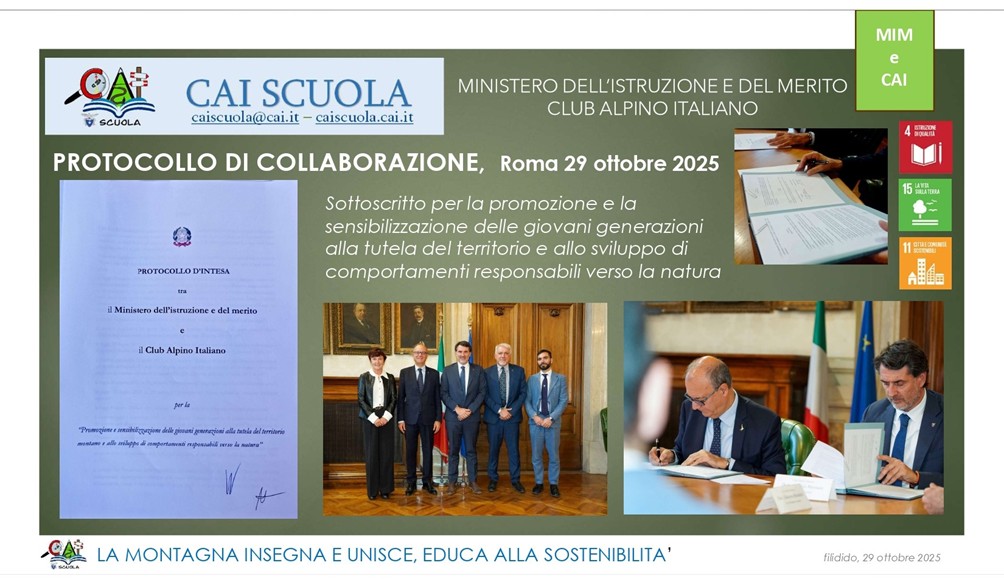 La firma nell’Ottobre 2025 del Protocollo con il Ministero dell’Istruzione e del Merito (https://www.mim.gov.it/web/guest/-/protocollo-d-intesa-tra-il-ministero-dell-istruzione-e-del-merito-e-il-club-alpino-italiano) supporta ulteriormente la realizzazione di attività formative congiunte tra scuola e CAI per la conoscenza e valorizzazione del patrimonio paesaggistico, storico e naturalistico italiano; lo svolgimento di esperienze dirette in montagna e l’attivazione di percorsi di educazione civica, ambientale e allo sviluppo sostenibile.