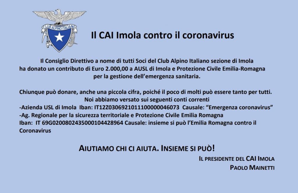 Il Consiglio Direttivo a nome di tutti Soci del Club Alpino Italiano sezione di Imola ha donato un contributo di Euro 2.000,00 a AUSL di Imola e Protezione Civile Emilia-Romagna per la gestione dell’emergenza sanitaria.